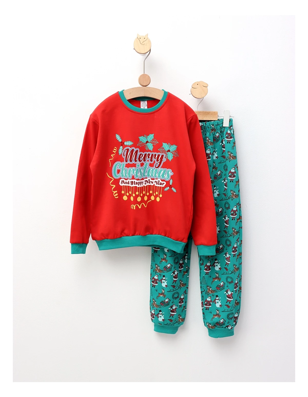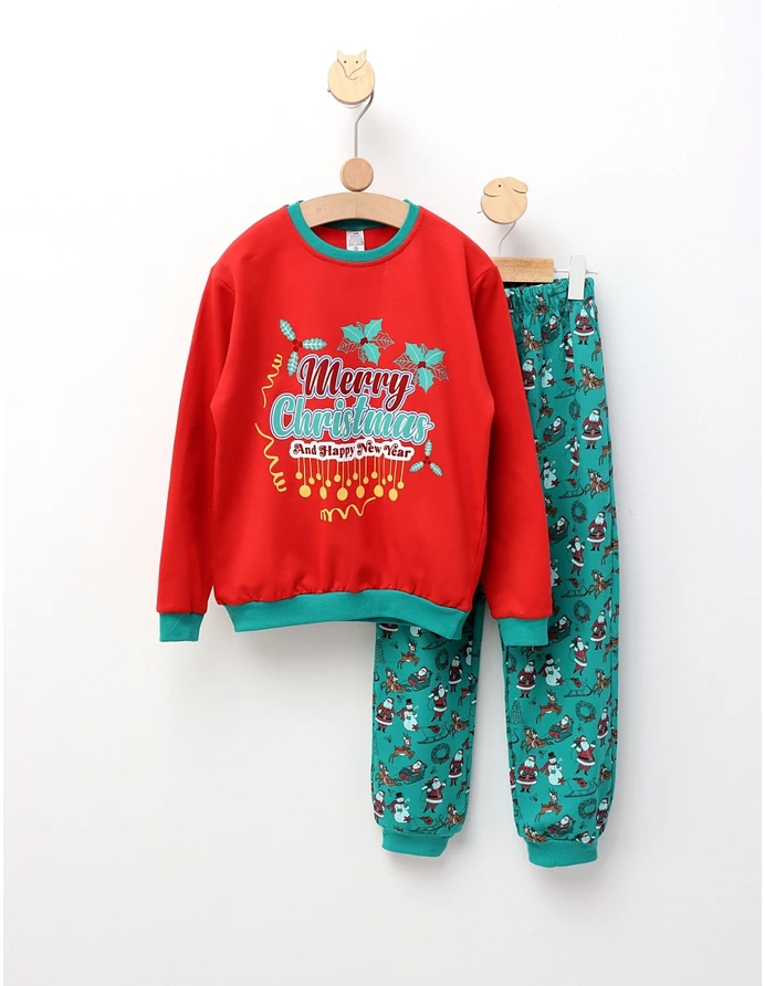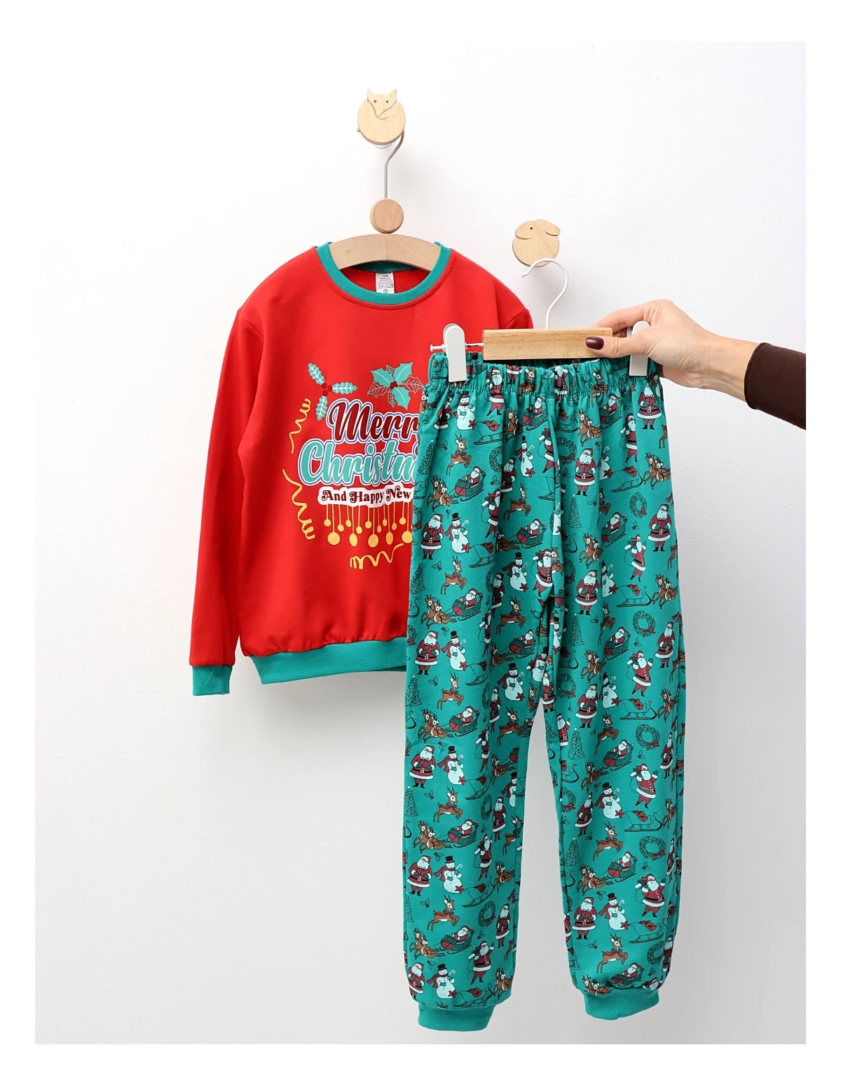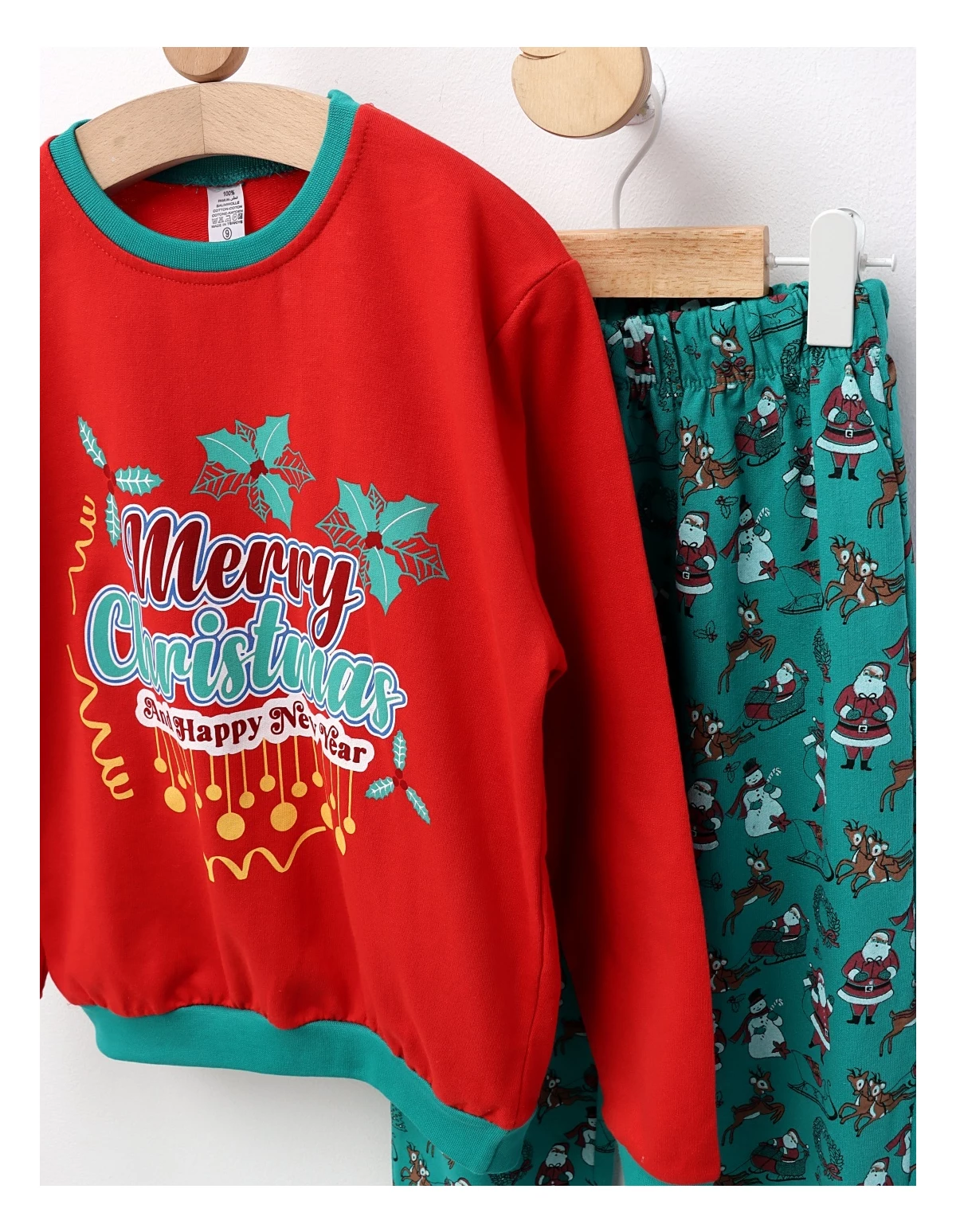 Set de Crăciun pentru copii, care include o bluză cu imprimeu vesel cu 'Merry Christmas and Happy New Year și decorațiuni, pantaloni cu elastic în talie și imprimeuri cu Moș Crăciun și reni. Confecționat din 100% bumbac, acest set oferă confort, siguranță și un aspect festiv, perfect pentru zilele magice ale sărbătorilor. Ideal pentru poze de sezon și momente de bucurie alături de cei dragi!