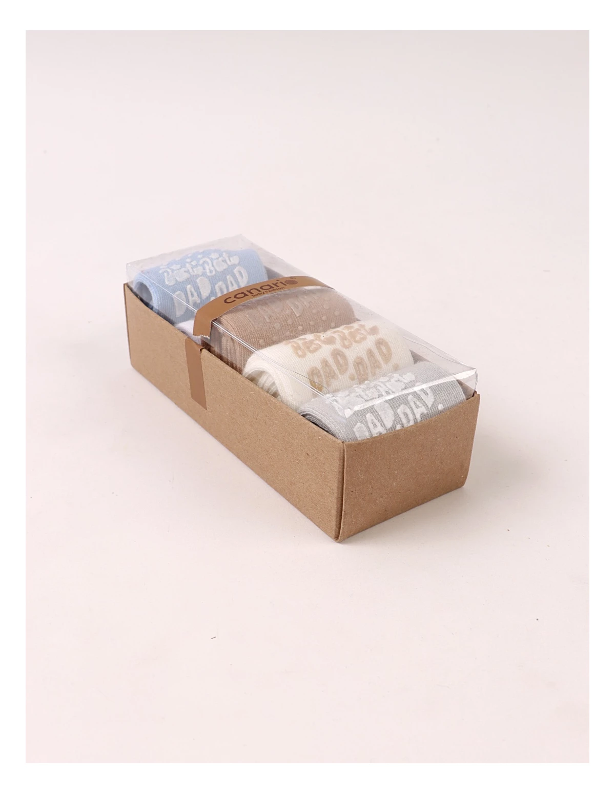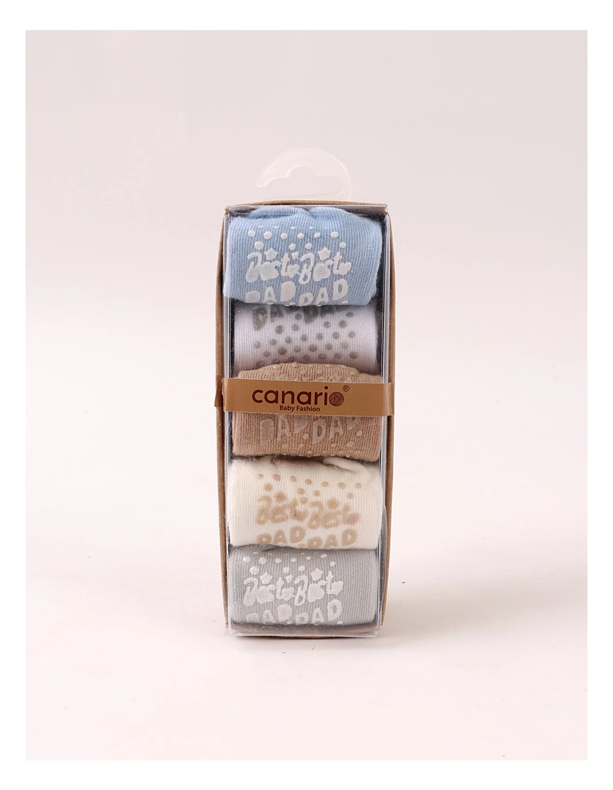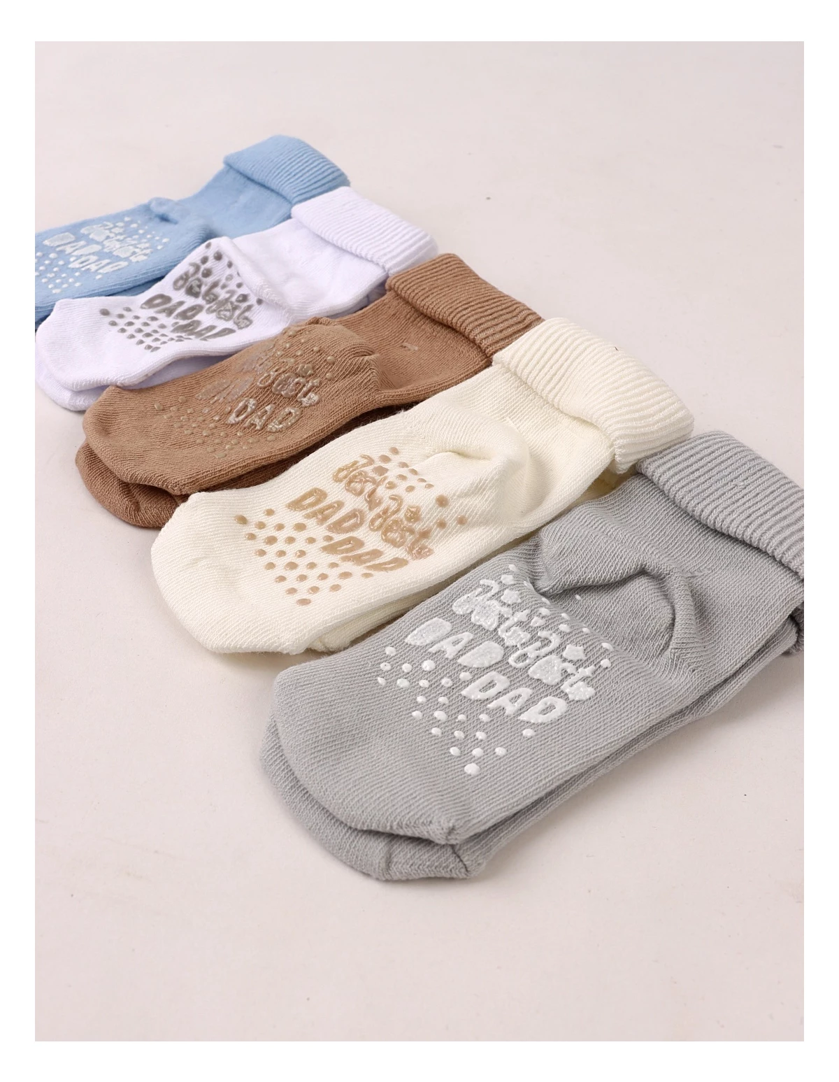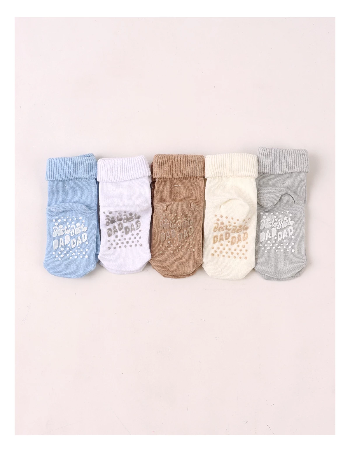 Set de 5 perechi de șosete pentru bebeluși, potrivite între 6 și 12 luni, realizate din 100% bumbac moale și plăcut la purtare. Culorile neutre – ecru, gri, maro, alb și bleu – se combină ușor cu orice ținută. Talpa are protecție antiderapantă cu inscripția „BEST DAD”, oferind siguranță la primii pași. Produsul este ambalat la cutie, ideal pentru cadou sau utilizare zilnică.
