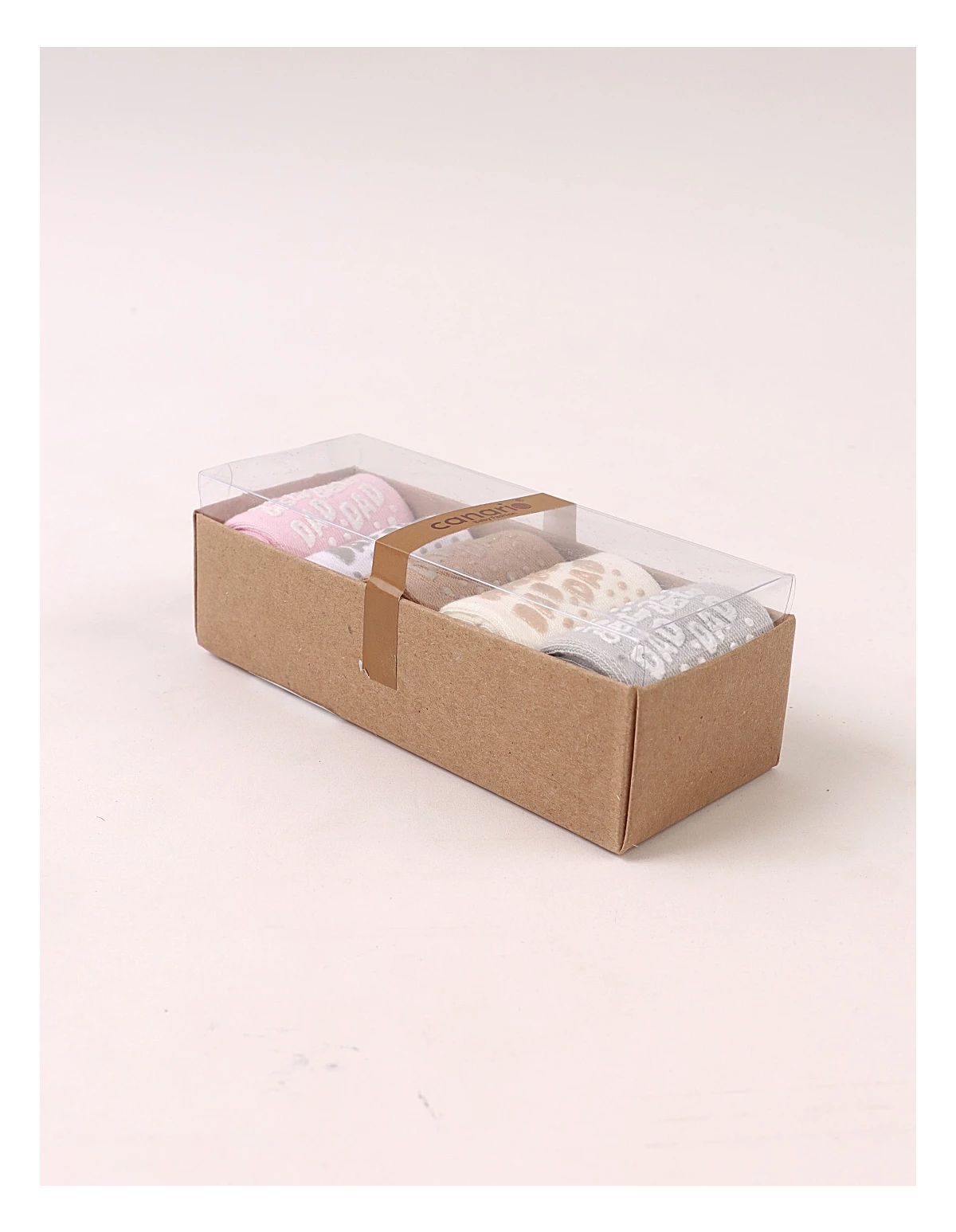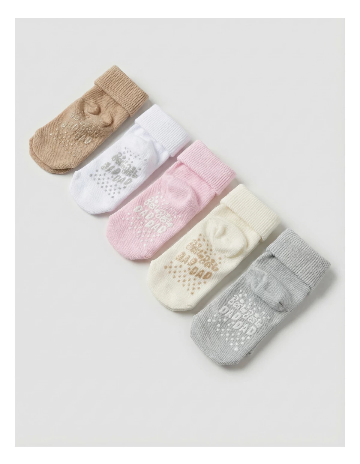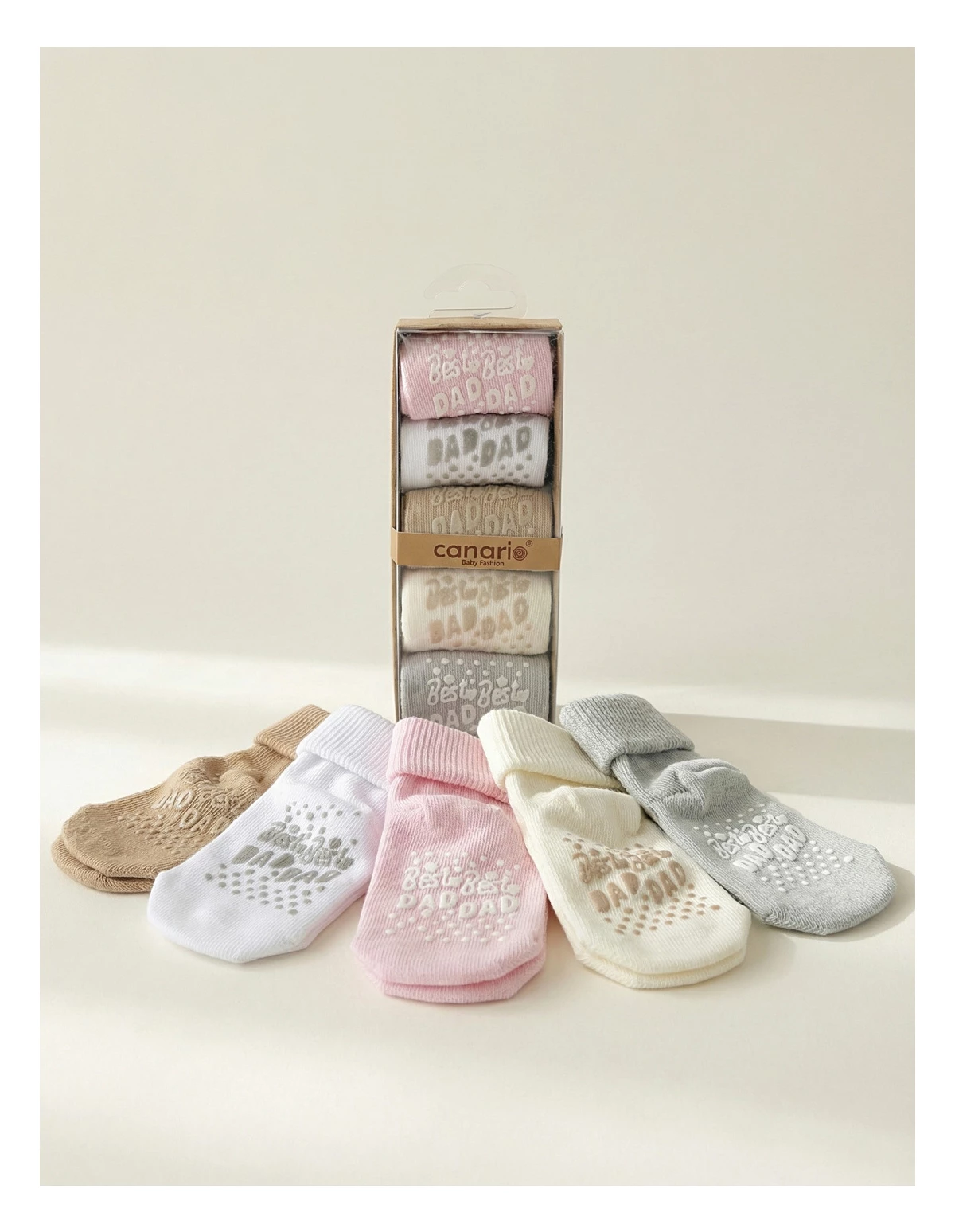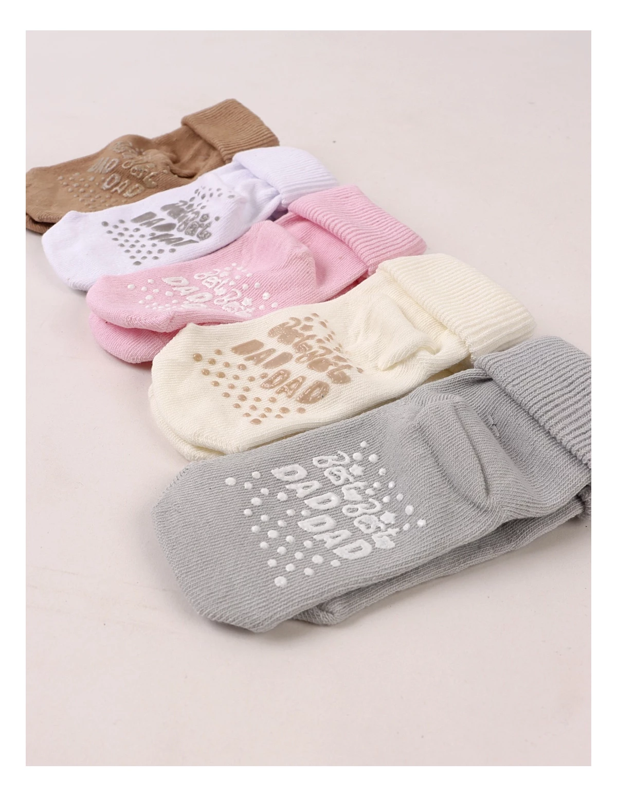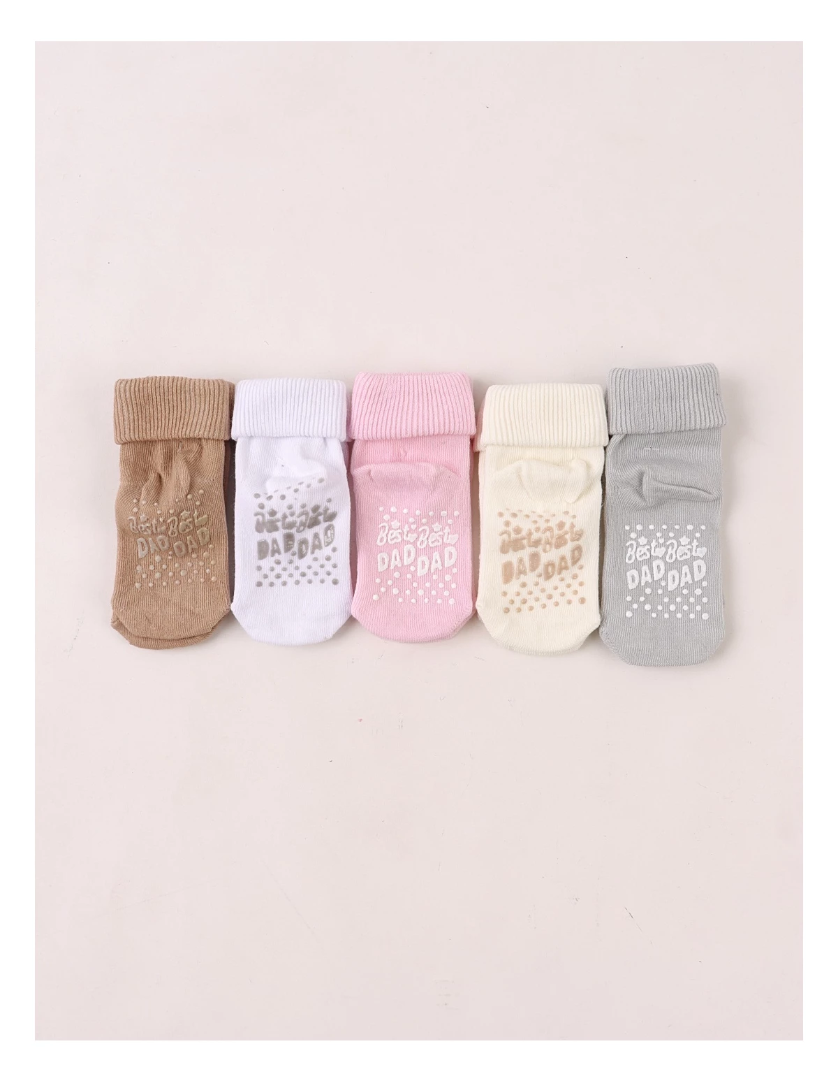 Set de 5 perechi de șosete pentru bebeluși, potrivite între 6 și 12 luni, confecționate din 100% bumbac moale și delicat cu pielea. Culorile neutre – ecru, gri, maro, alb și roz – se asortează ușor cu orice ținută. Talpa este prevăzută cu antiderapant și inscripția „BEST DAD”, oferind siguranță la primii pași. Produsul vine ambalat la cutie, perfect pentru cadou sau purtare zilnică.
