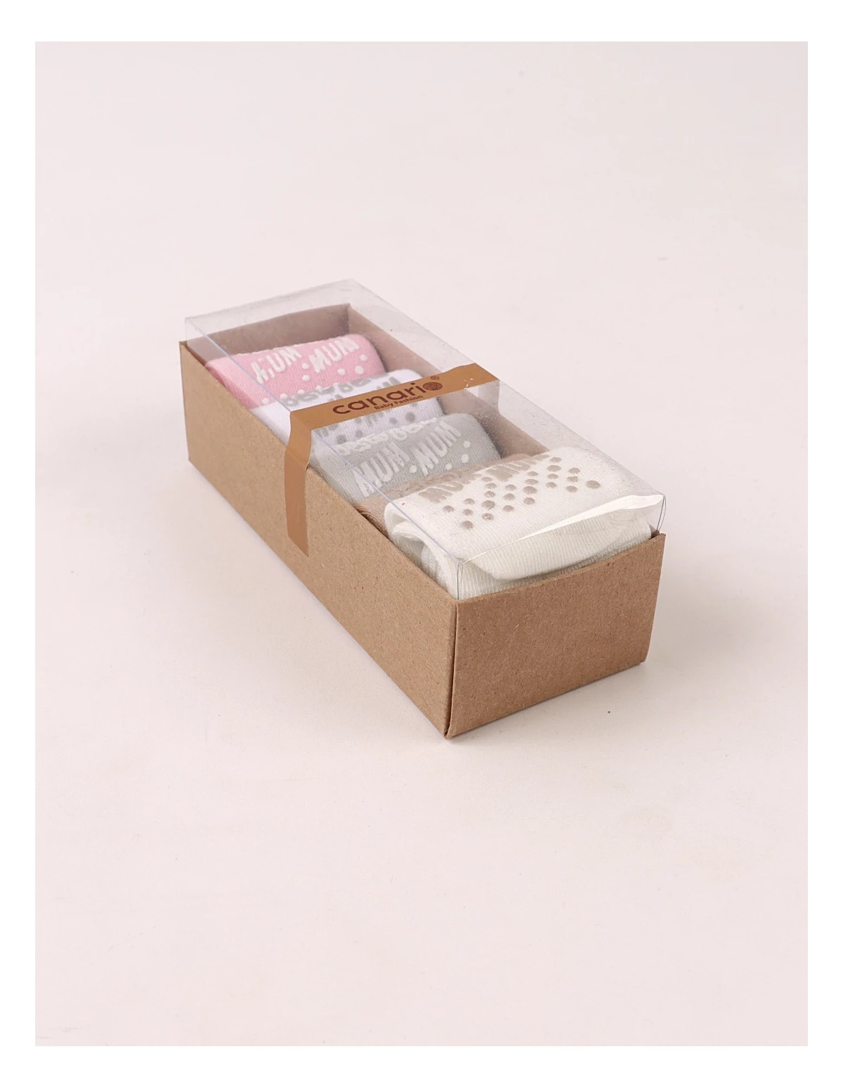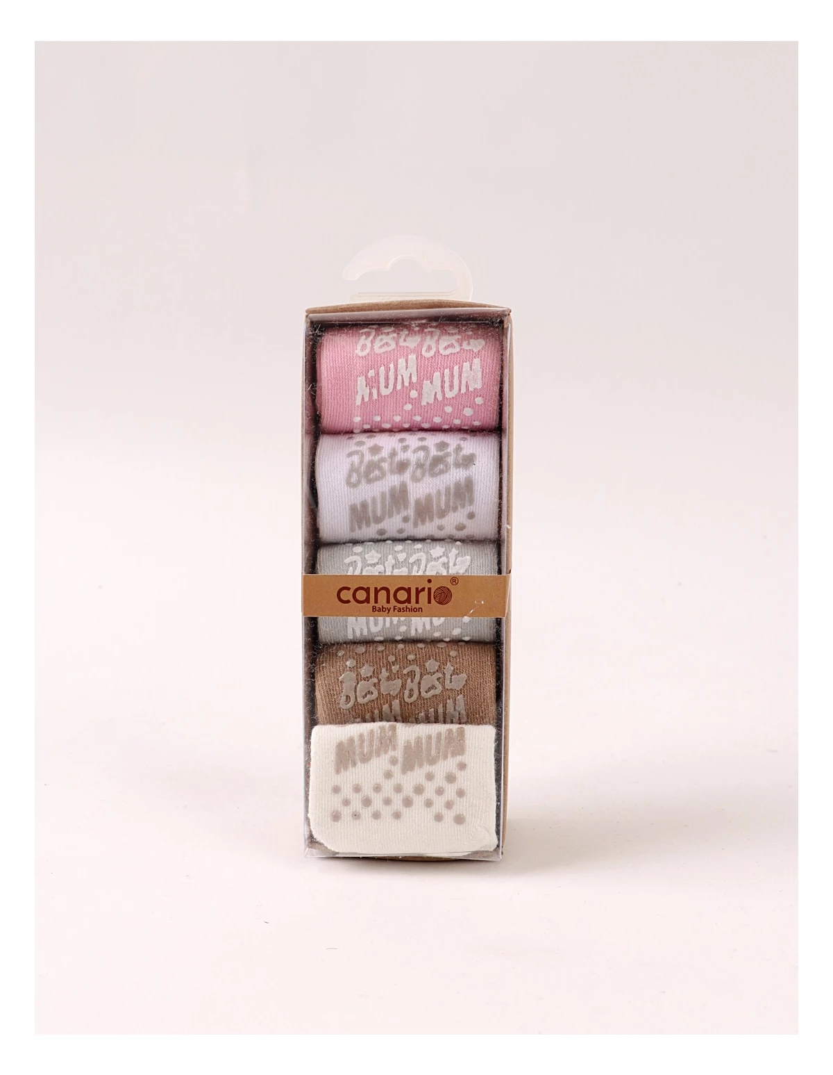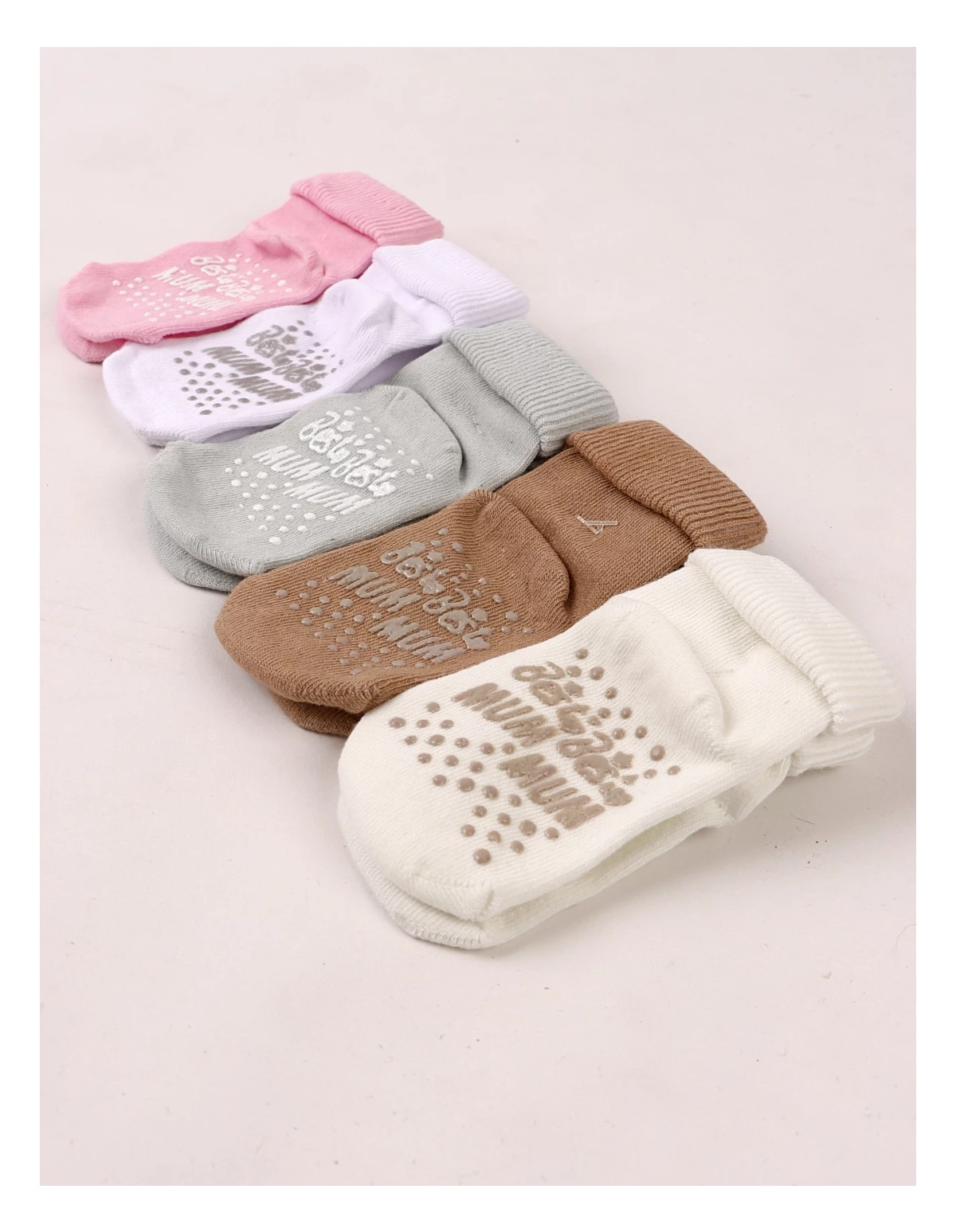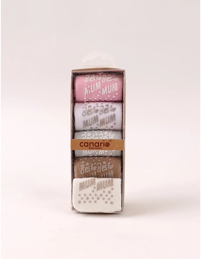 Set de 5 perechi de șosete pentru bebeluși, potrivite între 6 și 12 luni, realizate din 100% bumbac moale și confortabil. Culorile neutre – ecru, gri, maro, alb și roz – se potrivesc ușor cu orice ținută. Talpa are protecție antiderapantă cu inscripția „BEST MUM”, oferind aderență și siguranță la primii pași. Produsul este ambalat la cutie, ideal pentru cadou sau utilizare zilnică.