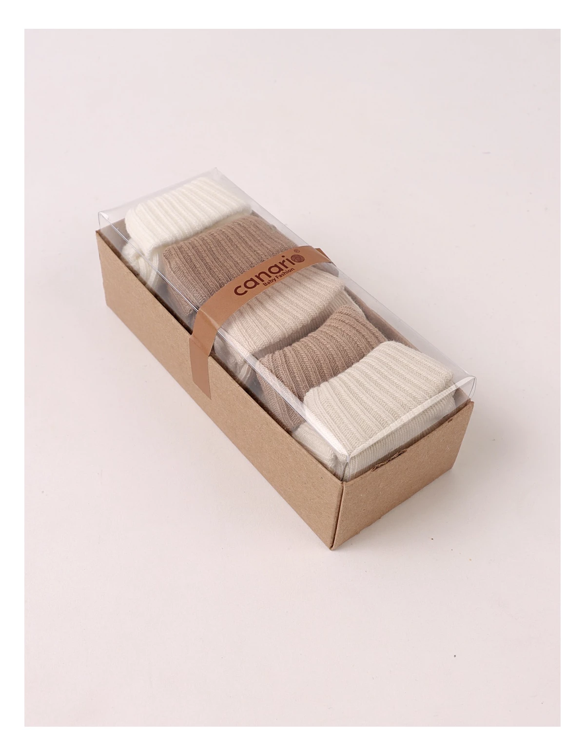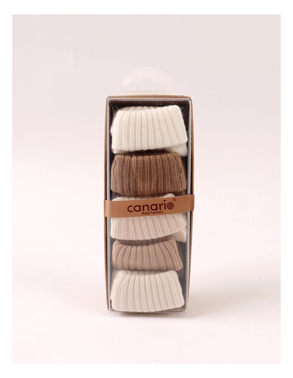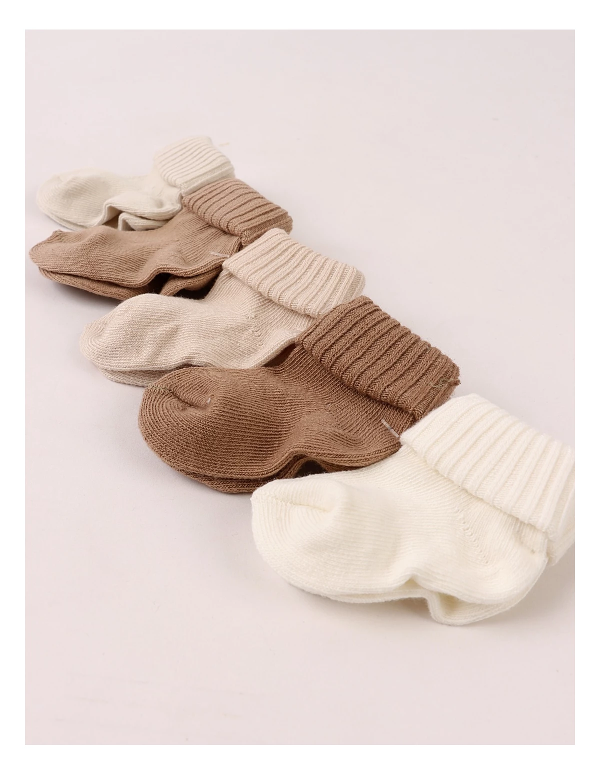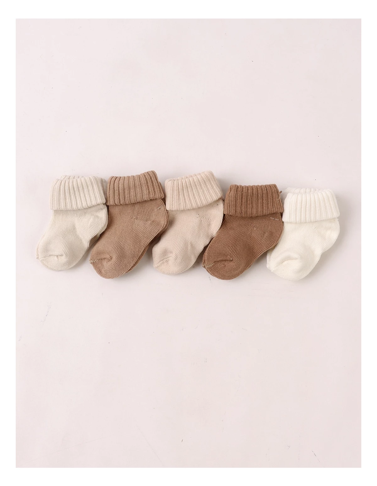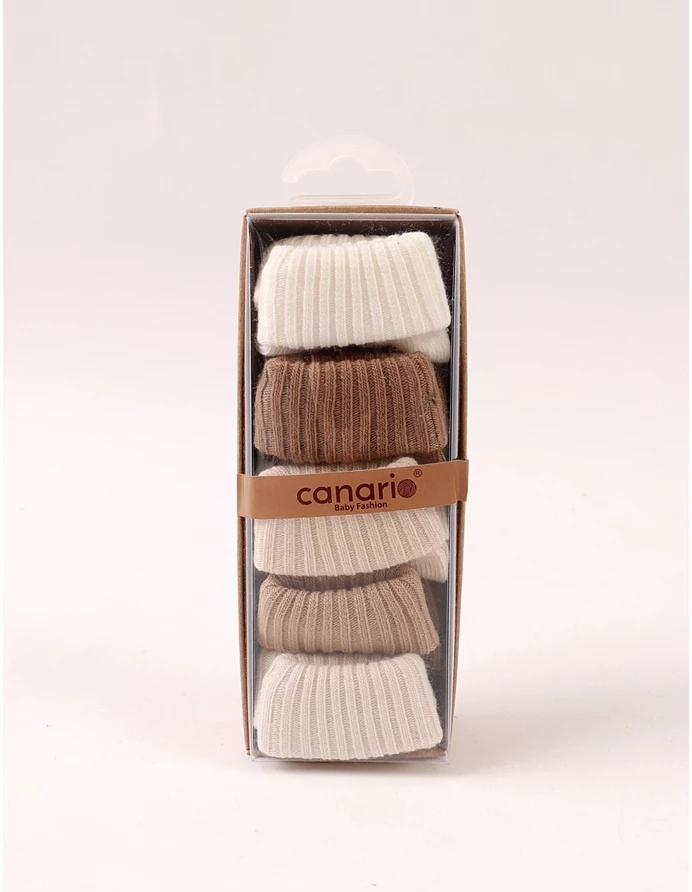 Set de 5 perechi de șosete pentru bebeluși, potrivite între 3 și 12 luni, realizate din 100% bumbac moale și confortabil. Culorile neutre – ecru, bej și maro – se asortează ușor cu orice ținută, fiind ideale pentru purtare zilnică. Produsul este ambalat la cutie, perfect pentru cadou sau pentru organizarea garderobei celui mic.
