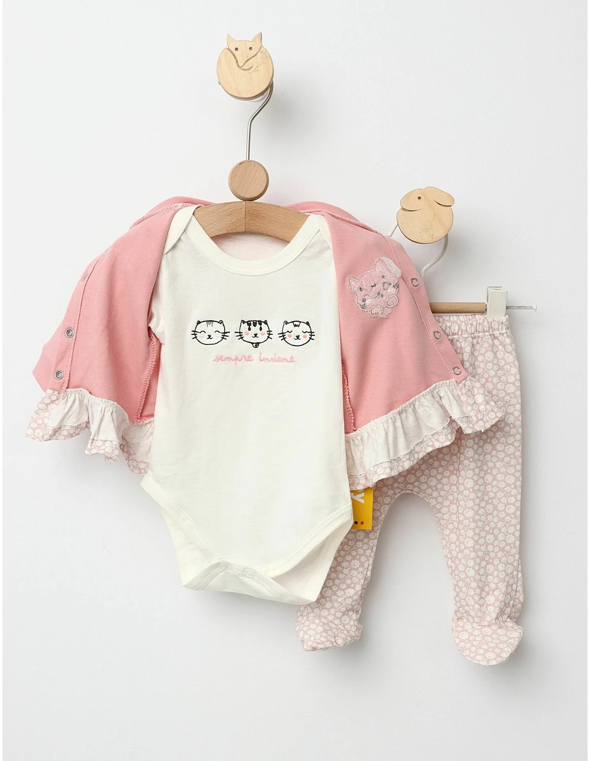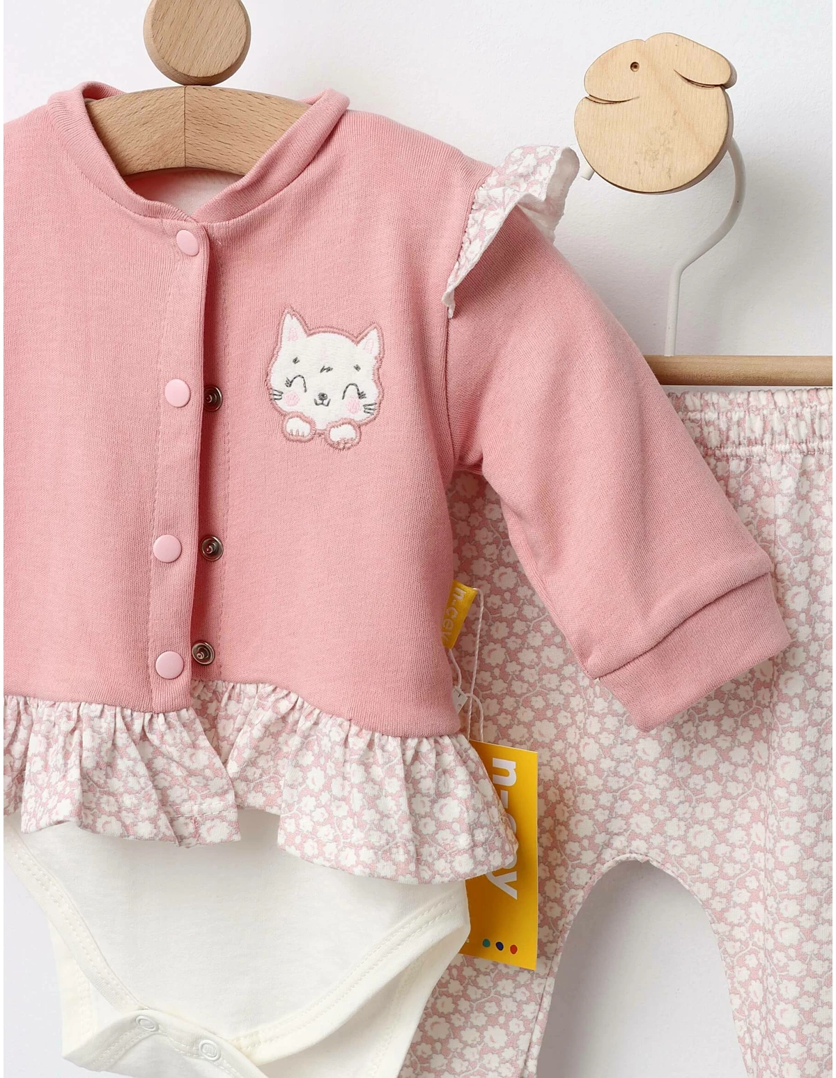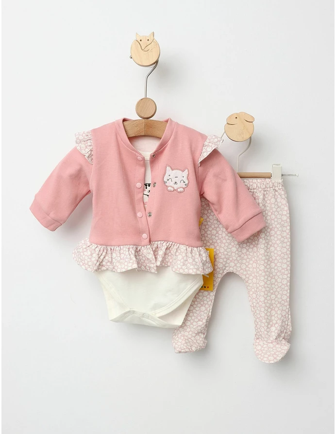Acest set de 3 piese pentru fetițe este perfect pentru a aduce un plus de eleganță și confort garderobei micuței tale. Bluzița este decorată cu volănașe fermecătoare și dispune de o deschidere practică cu capse, facilitând îmbrăcarea. Body-ul, imprimat cu pisicuțe drăgălașe, adaugă un element jucăuș și vesel ținutei. Pantalonașii vin cu un design ingenios ce include botoșei integrați, asigurând că micuța ta este protejată de frig de la cap până la picioare. Confecționat din 100% bumbac, acest set promite o senzație moale și respirabilă, ideală pentru pielea sensibilă a copiilor. Fie pentru joacă sau somn, acest set este o alegere minunată, combinând practicitatea cu un stil adorabil! Haine bebe, haine bebelusi, haine nou nascut, haine copii.